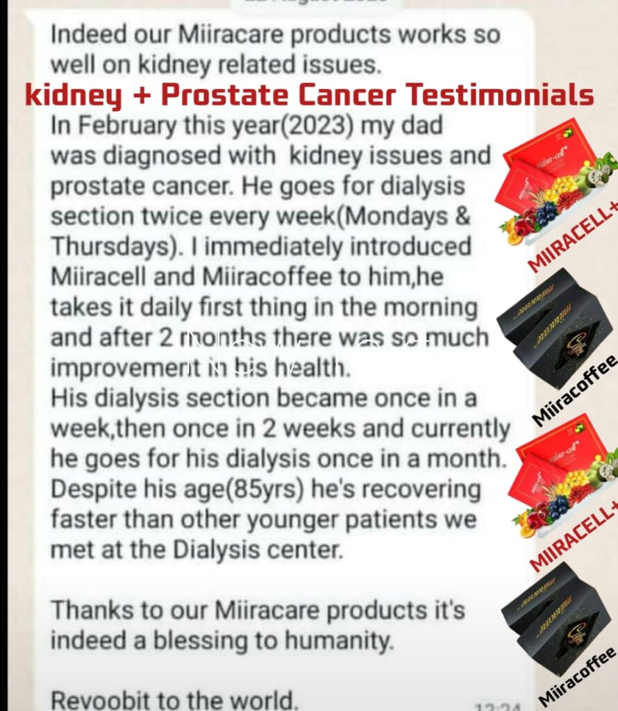 My Dad was diagnosed with kidney issues and prostrate cancer in February 2023. I immediately introduced Miiracell and Miiracoffee to him and after 2 months there was so much improvement in his health.